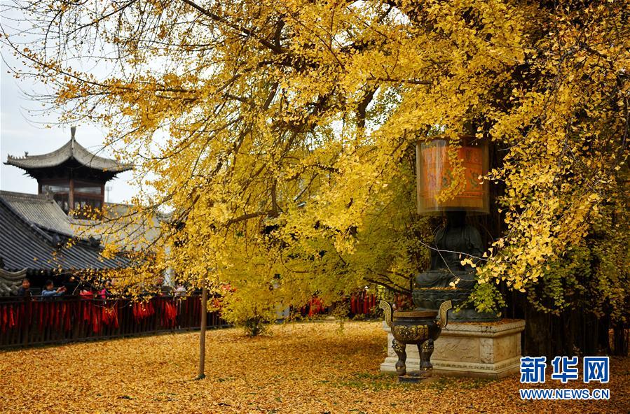 初冬时节,陕西省西安市长安区罗汉洞村终南山古观音禅寺内的千年银杏树满目金黄,落叶宛如金毯,吸引游客前来参观游览。
