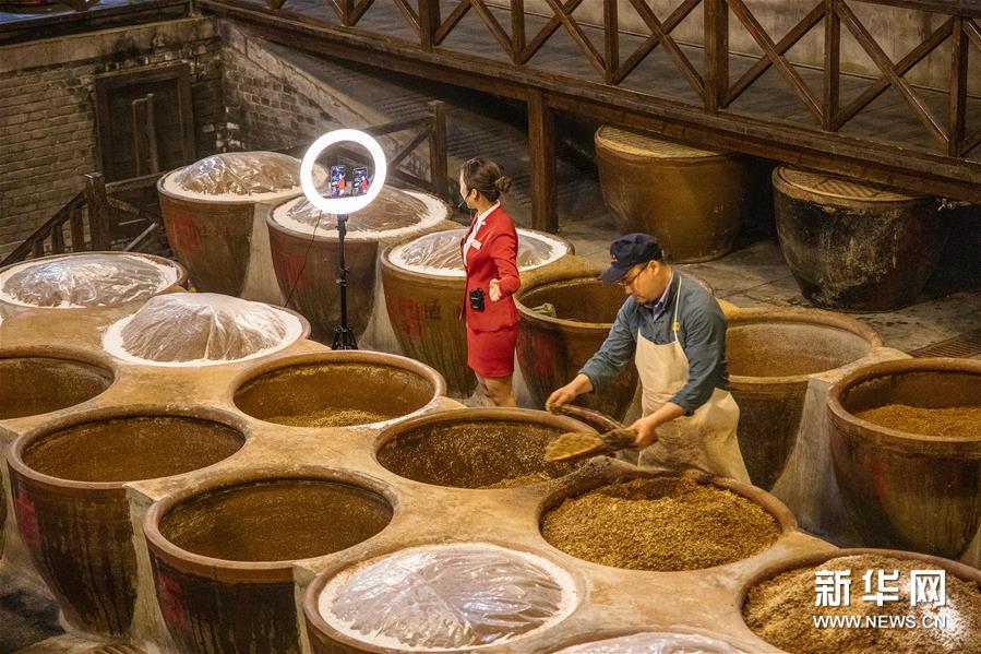 4月20日,在中国镇江醋文化博物馆,工作人员通过直播平台向观众讲解制醋工艺。封疆江 摄