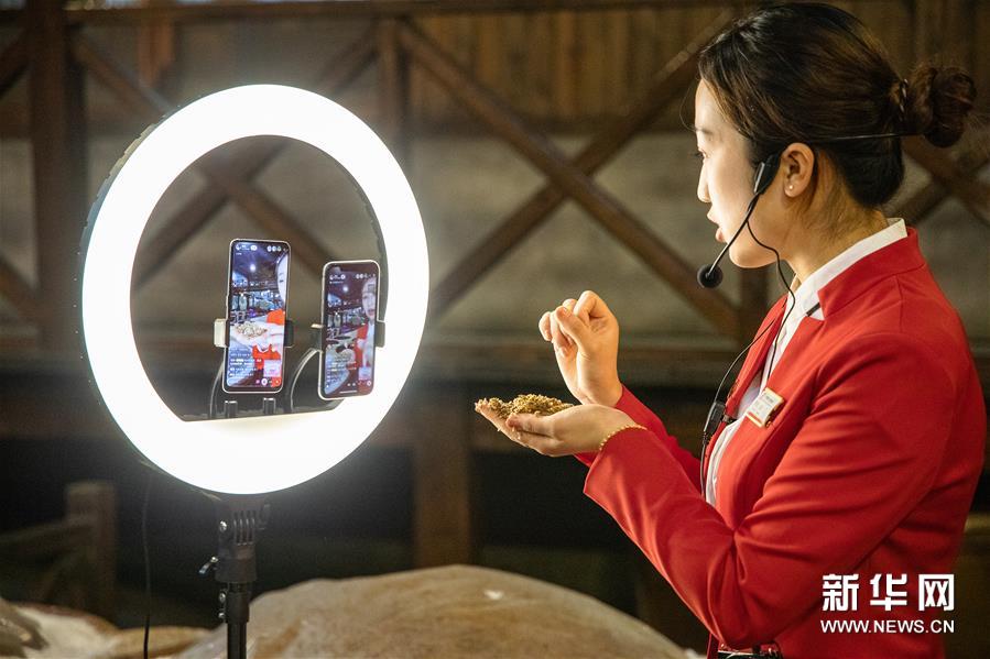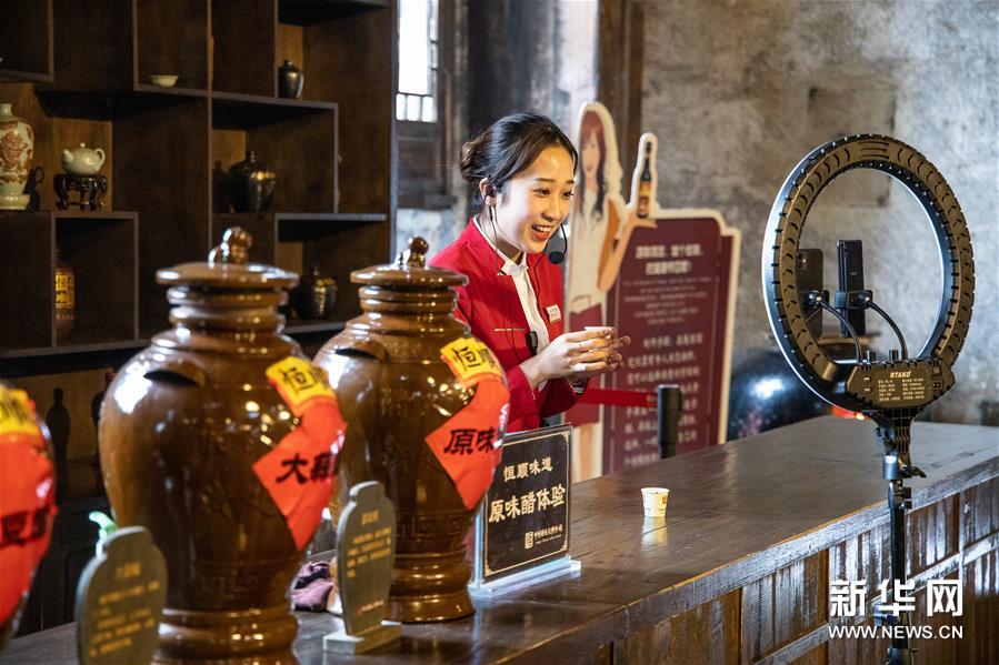 4月20日,在中国镇江醋文化博物馆,工作人员通过直播平台向观众介绍醋产品。封疆江 摄