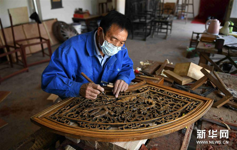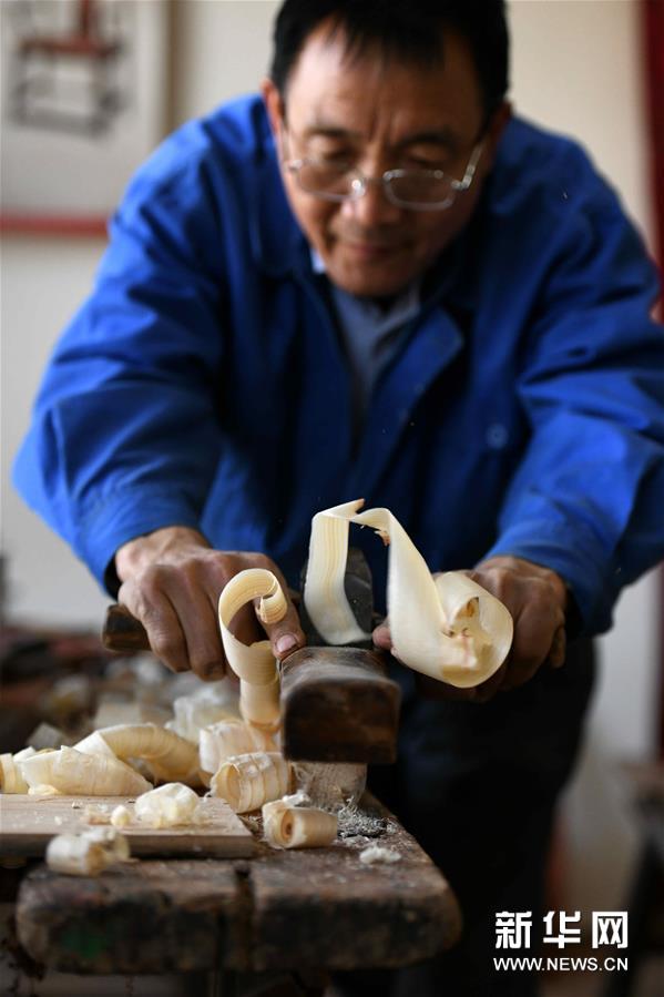 4月21日,在石家庄栾城区窦妪镇南赵台村,栾城杨氏家具制作技艺代表性传承人杨生辰在工作室里对家具进行精细加工。 新华社发(陈其保 摄)