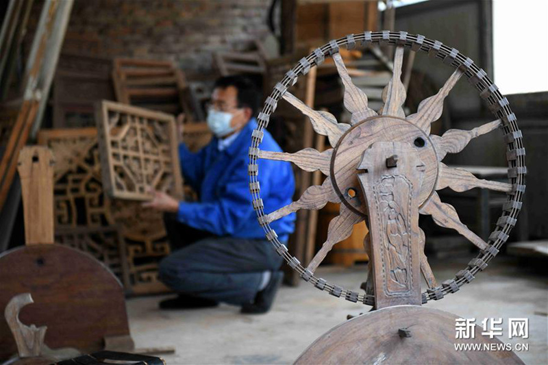 4月21日,在石家庄栾城区窦妪镇南赵台村,栾城杨氏家具制作技艺代表性传承人杨生辰在工作室里修复旧式家具。新华社发(陈其保 摄)
