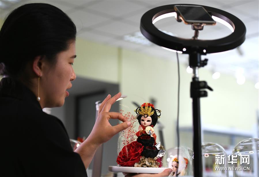 4月27日,在河北省石家庄市那些花儿文化创意有限公司,工作人员录制视频推介文创产品。 许建园 摄