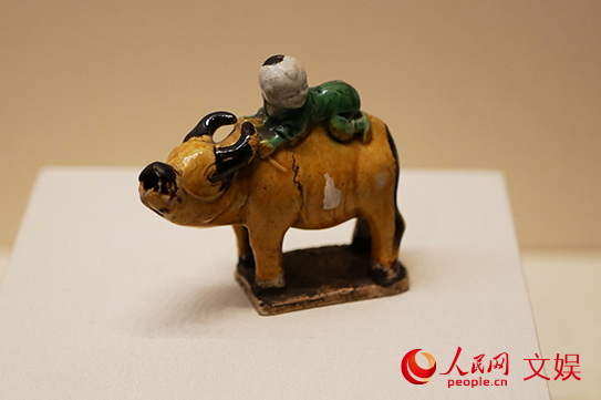 “牛事如意——辛丑牛年迎春文化展”中的三彩牧童骑牛。人民网韦衍行摄