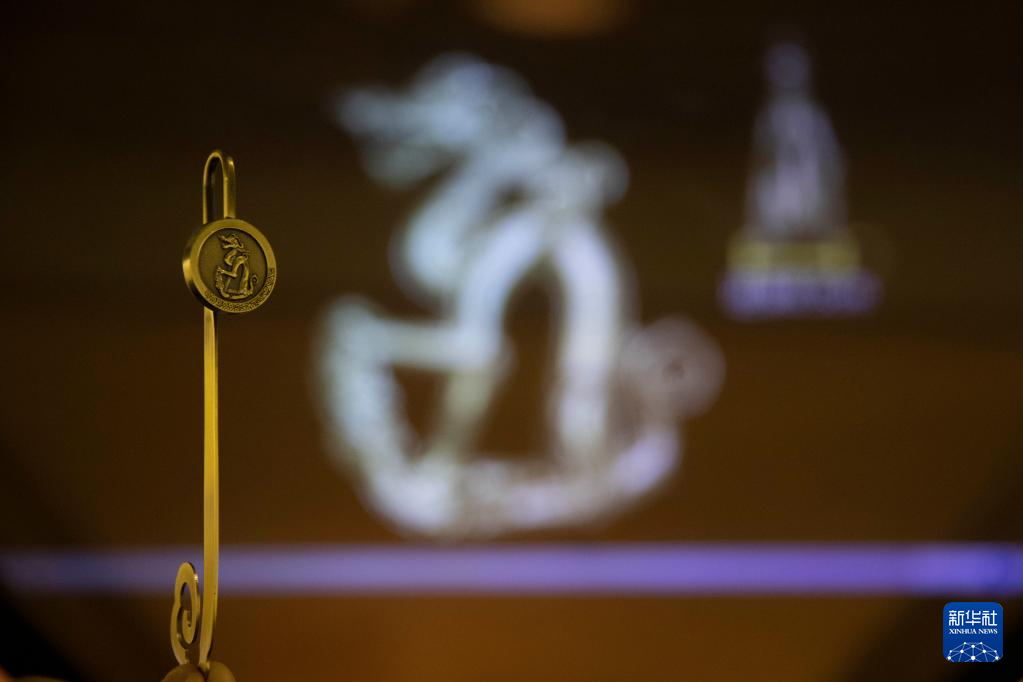 黑龙江省博物馆内展示的以铜坐龙为原型设计的云起龙骧案饰(5月16日摄)。
