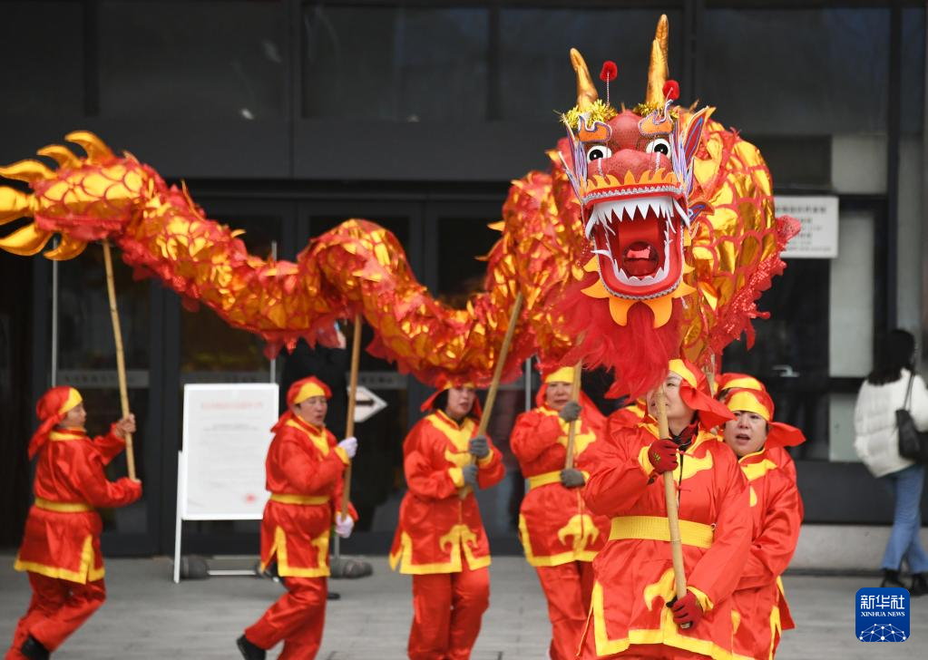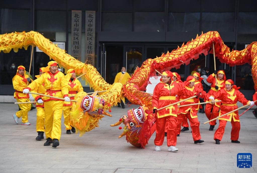 1月14日,在海淀北部文化中心外,居民在表演舞龙。新华社记者 任超 摄