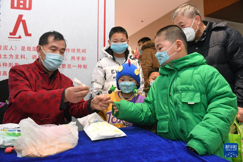 1月14日,在海淀北部文化中心,小朋友在观看“捏面人”。新华社记者 任超 摄