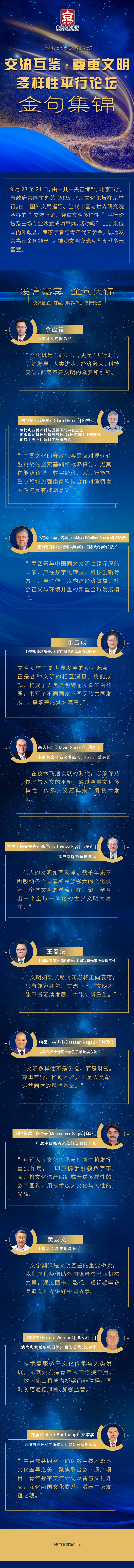9月23至24日,由中共中央宣传部,北京市委、市政府共同主办的2025北京文化论坛在京举行。由中国外文局指导、当代中国与世界研究院承办的“交流互鉴:尊重文明多样性”平行论坛及三场专业沙龙成功举办。活动吸引100余位国内外政要、专家学者与青年代表参会,现场发言嘉宾金句频出,为推动文明交流互鉴贡献多元智慧。