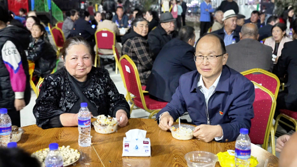 在阿依丁库勒村的活动现场,同样洋溢着欢乐团圆的节日气氛。村民们围坐在一起,共享热气腾腾的火锅宴,现场欢声笑语不断。丰富多彩的文艺节目同步上演,为这场“同吃一锅饭”的团聚增添了更多欢乐与温情。