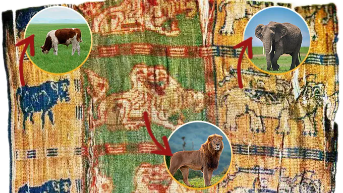 织锦最引人注目的,是方格内栩栩如生的三种神兽——牛:中原农耕文明的象征,代表勤劳与富足;狮子:随佛教与西域文化传入,象征威严与力量;大象:联系南亚与佛教艺术,寓意吉祥与庄严。三种文化符号共织一锦,展现了北朝时期对东西方元素的包容与整合,成为丝路文明对话的“微型剧场”。