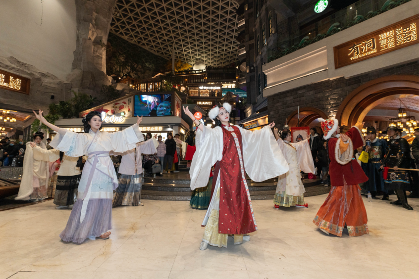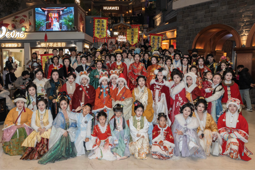 队伍最终抵达融合山景与市井的文旅综合体——这有山,上百名汉服爱好者和这有山产生了奇妙的共鸣,汉服舞蹈在入口处完美上演、汉服巡游队伍穿梭于室内“山道”与店铺之间,完成一场传统服饰与现代商业空间的诗意对话,也让游客在打卡消费的同时,沉浸式感受汉服之美。