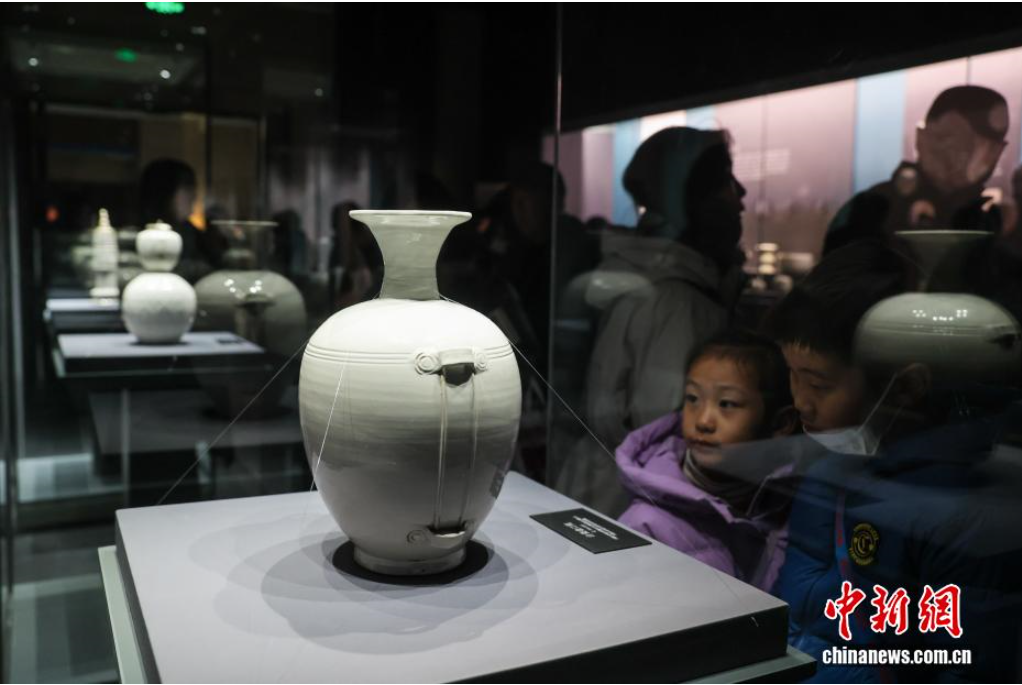 11月30日,山西太原,中国首个以“白瓷与民族融合”为主题的瓷器类展览——“北白——白瓷与民族融合”特展在山西博物院启幕,展览汇聚来自全国14家文博机构的200余件白瓷珍品。图为观众参观欣赏。中新社记者 武俊杰 摄