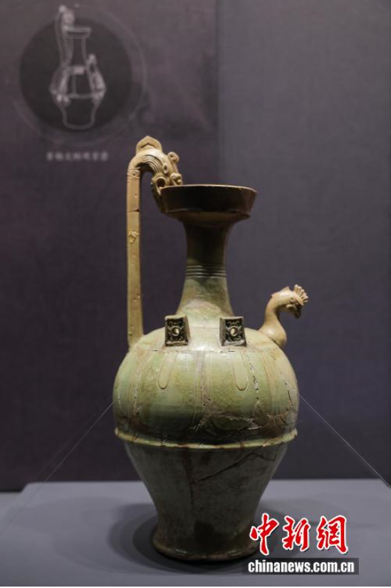 11月30日,山西太原,中国首个以“白瓷与民族融合”为主题的瓷器类展览——“北白——白瓷与民族融合”特展在山西博物院启幕,展览汇聚来自全国14家文博机构的200余件白瓷珍品。图为青釉龙柄鸡首壶。中新社记者 武俊杰 摄