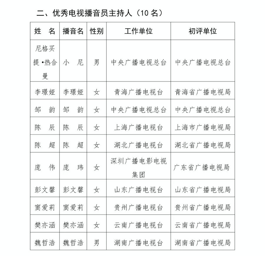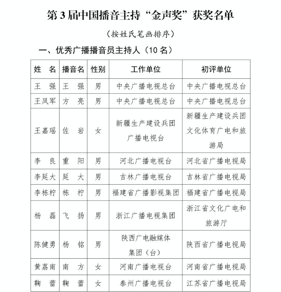新华社北京12月9日电(记者 白瀛)国家广播电视总局主办的第3届中国播音主持“金声奖”获奖名单9日公布。经过初评、复评、终评和公示,最终评选出优秀广播播音员主持人、优秀电视播音员主持人各10名。