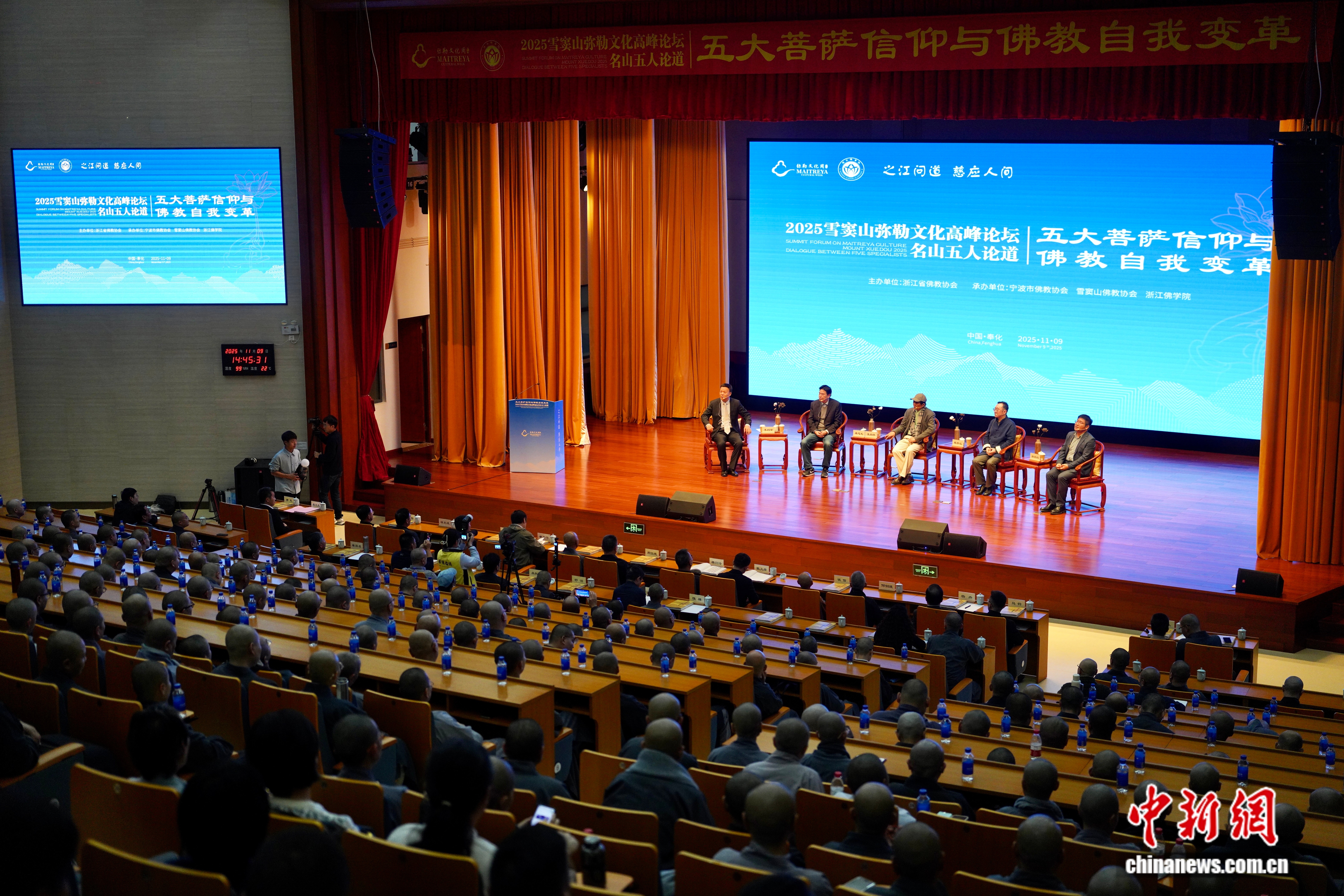 2025年11月9日,2025雪窦山弥勒文化高峰论坛名山五人论道在位于浙江宁波奉化的浙江佛学院(总部)太虚大讲堂举行,多位专家与会分享交流。 中新社记者 董易鑫 摄