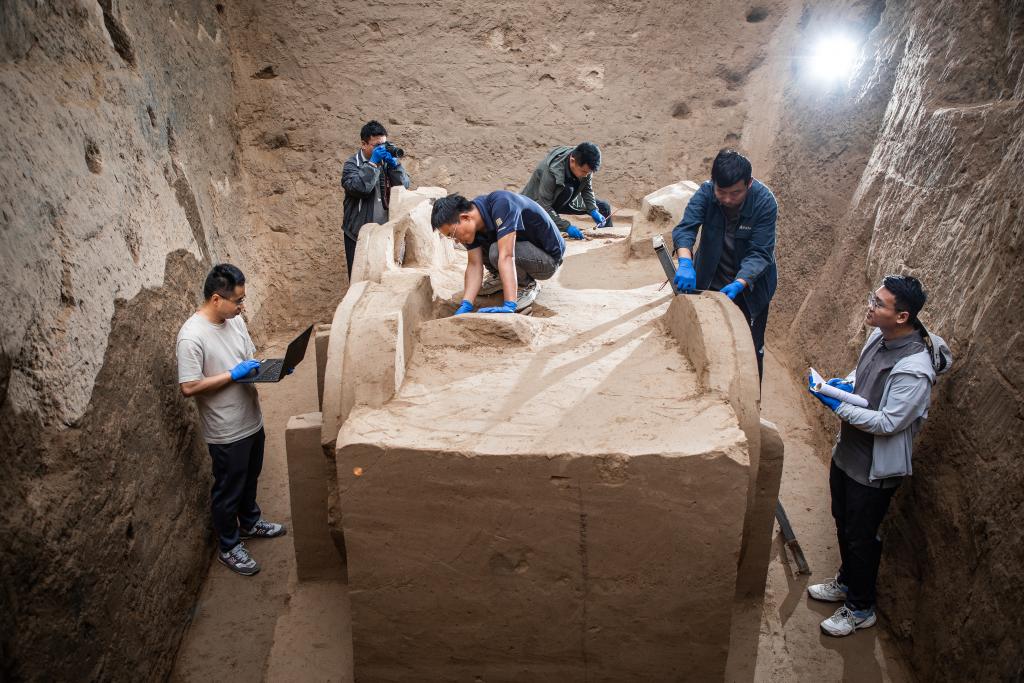 陕西省考古研究院寨沟遗址考古队在陕西清涧瓦窑沟墓地M4号墓葬清理马车(2025年9月11日摄)。新华社发