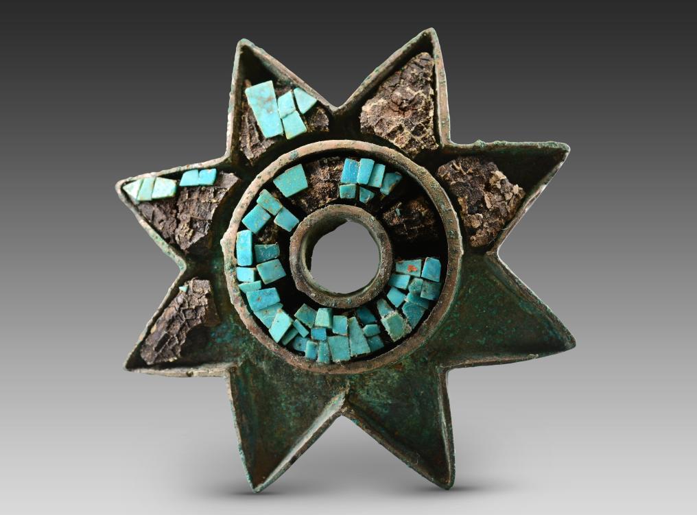 陕西清涧寨沟遗址后刘家塔墓地出土的镶绿松石铜饰(资料照片)。新华社发(陕西省考古研究院提供)