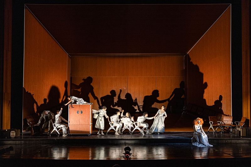 木质纹理的框体覆盖整个舞台,倾斜的坡面延伸向乐池,来自格鲁吉亚新剧院团队的舞美设计让看似简约的舞台布景暗藏玄机。光影交织下,舞台空间的纵深得到了充分的运用,道具的排列组合形成了不同景观,《樱桃园》的文本在这样的设计理念下变得活灵活现,掩藏于原作中的诸多线索也得到了清晰的展示。