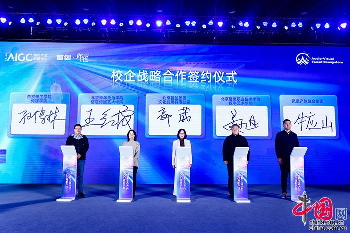 作为北京AIGC视听产业创新中心系统性培育AIGC创作源的关键举措,本次大会集中展示了首创郎园过去一年在产教融合与产业人才服务方面的扎实成果。除了与中国传媒大学、北京电影学院、中央美术学院等顶尖文化艺术院校的深度合作外,大会上,首创郎园结合产业实际需求,进一步拓展人才培养合作网络,与北京青年政治学院、北京信息职业技术学院、燕京理工学院、凤凰产教融合集团等一批应用型、职业类院校及机构签署了新一轮校企战略合作协议,通过完善学术研究、艺术引领、应用开发与技能实践的多层次人才培养路径,形成了金字塔式的稳固人才供给结构。