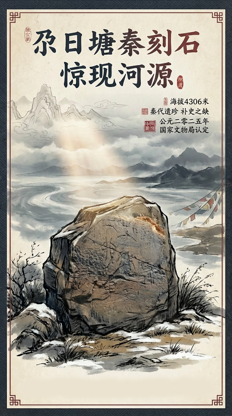 尕日塘秦刻石位于青海省果洛藏族自治州玛多县扎陵湖北岸。2025年6月以来,国家文物局安排中国文化遗产研究院、青海省文物考古研究院组建工作专班,调集石质文物保护、秦汉考古、古文字学和书法篆刻等领域专业人员实地勘察并召开论证会。9月15日,国家文物局在北京举行新闻发布会,确认青海省玛多县发现的石刻为秦代石刻,定名为“尕日塘秦刻石”,这是我国目前已知唯一存在原址且海拔最高的秦代刻石。