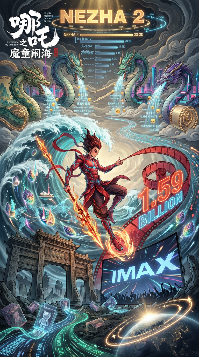 2025年1月29日,《哪吒之魔童闹海》(哪吒2)上映,是2019年现象级动画《哪吒之魔童降世》的续集。从“魔童降世”到“闹海涅槃”,《哪吒2》在更宏大的世界观中实现国漫升级。影片上映后接连刷新多项影史纪录,全球累计票房达159亿元,跻身全球影史票房第五名,成为中国动画电影的重要里程碑,不仅创下国产动画的票房新高度,更树立了电影工业制作与艺术表达的双重标杆。
