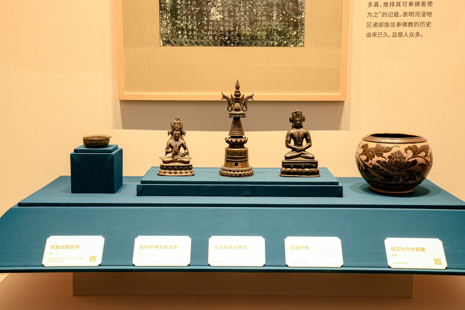 本次展览汇聚精选文物84件/套、壁画临摹艺术品113件,其中包括新石器时代舞蹈纹彩陶盆、明代永宣宫廷造像巅峰之作——明永乐款鎏金铜观音菩萨像、明代茶马互市国家信用凭证金牌信符、见证丝路繁华的唐代镶绿松石金链,均为青海各历史时期代表性的典型文物。另外,展览系统转化壁画数字化采集成果,通过高精度临摹壁画工艺抢救传承濒临失传的传统绘制技艺,借助数字影像载体全方位展现丝绸之路青海道千年文脉。